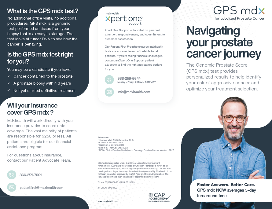 The Genomic Prostate Score (GPS) test is performed on a small tissue sample that’s already been taken from your most recent biopsy. Once the sample has arrived at the mdxhealth lab,* the GPS test measures the activity of the group of cancer-related genes that are in your tumor tissue. The activity of these genes can provide important information about how your specific cancer might behave in the future, including: